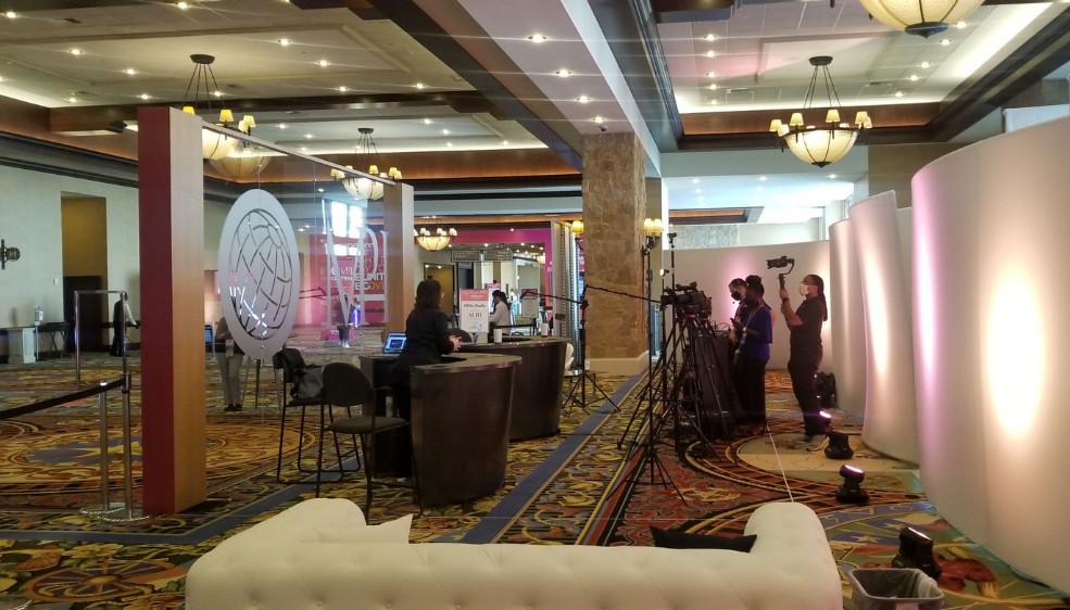 For added engagement, much of the broadcasting technology was featured in the ballroom versus backstage to give attendees an up-close look at how it all came together. On top of that, a broadcast desk was also set up in the common space area — this desk served as a way to tie the keynotes and education together, host 1:1 interviews, dive deeper into the design of the event itself, and cover COVID-19 protocols for viewers.