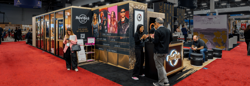 The challenge went beyond creating a single stunning booth at this key event— this hospitality leader needed an innovative exhibit system that could flex from an impressive 20×50 footprint down to 10×30 and 10×20 configurations for different shows, all while maintaining its signature Hard Rock aesthetic.