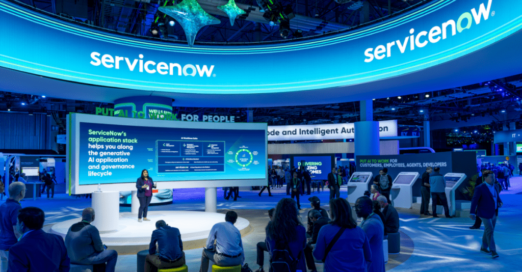 Collaborating with Freeman across logistics, production, and AV, with creative design led by Sparks, the team worked to create a more intuitive attendee journey. By reimagining the expo as a portal to information and excitement, the environment symbolized how ServiceNow is an easy-to-navigate, cohesive platform.