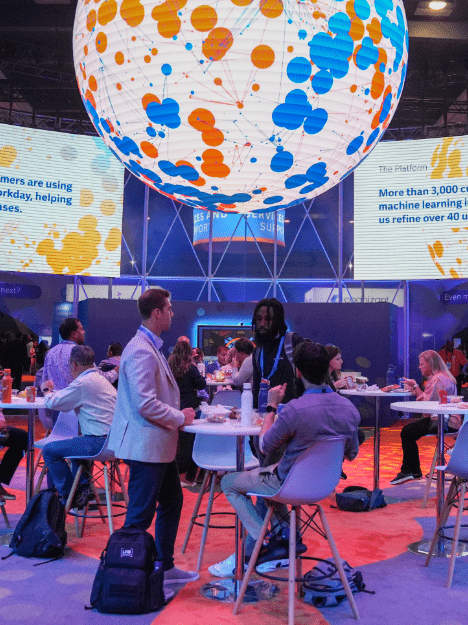 Designing and creating the trade show floor and hub included audio visual elements such as LED screens, interactive touchscreens, and engagement kiosks. But the show stopper was a massive, LED sphere, suspended like a disco ball at the center of the hub, immediately engaging and informing attendees.