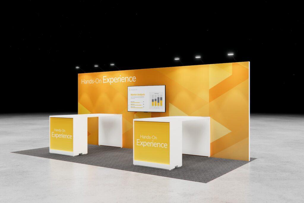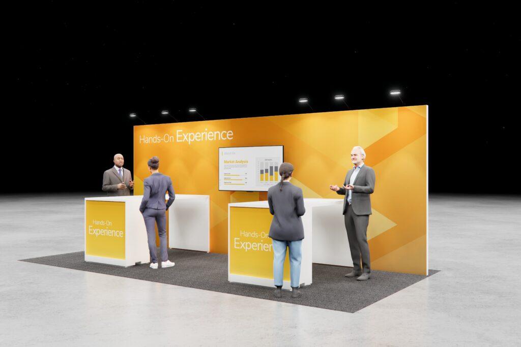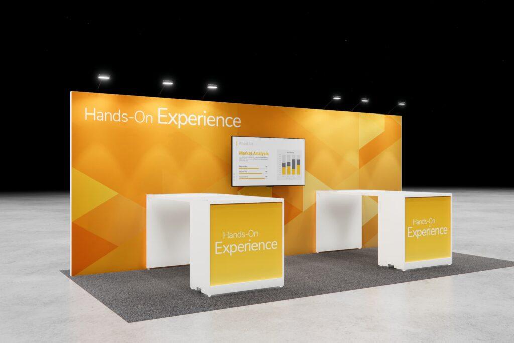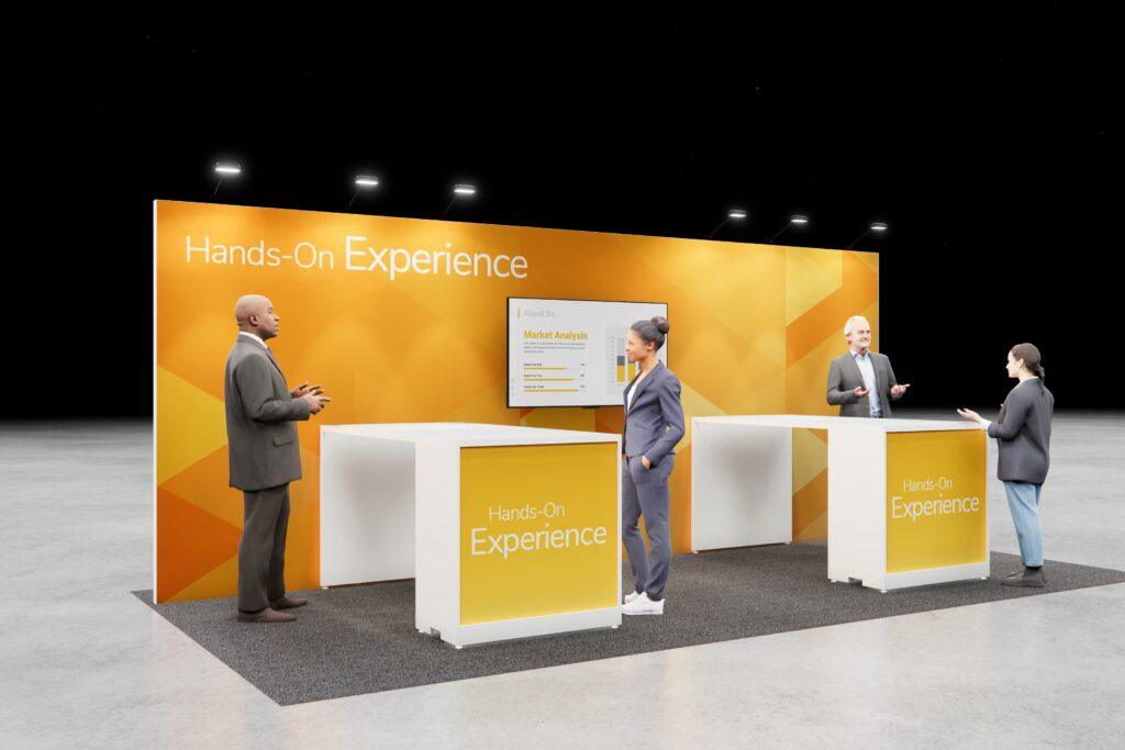 Feature your message front and center with a bold display perfect for presentations, while surrounding work areas create space for breakout conversations and one-on-one engagement—all in a sleek, functional layout.