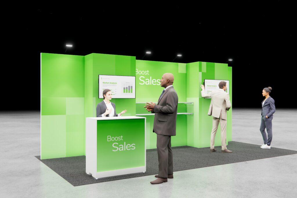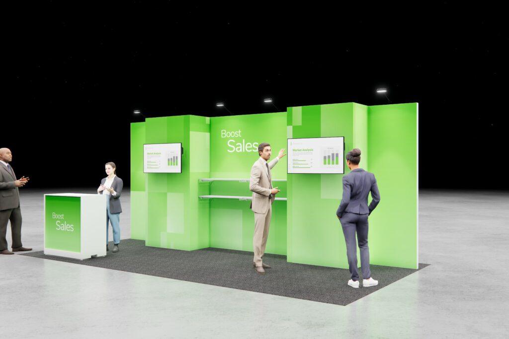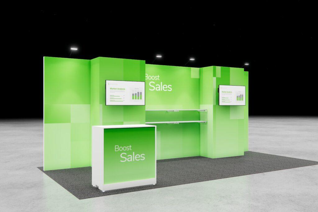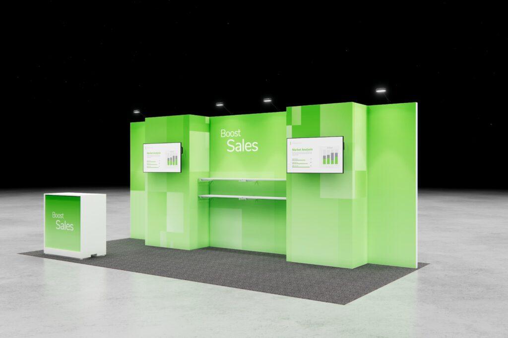 Combine digital displays with product-forward design to spotlight your brand. This layout offers plenty of space for messaging and easy access for hands-on interaction.