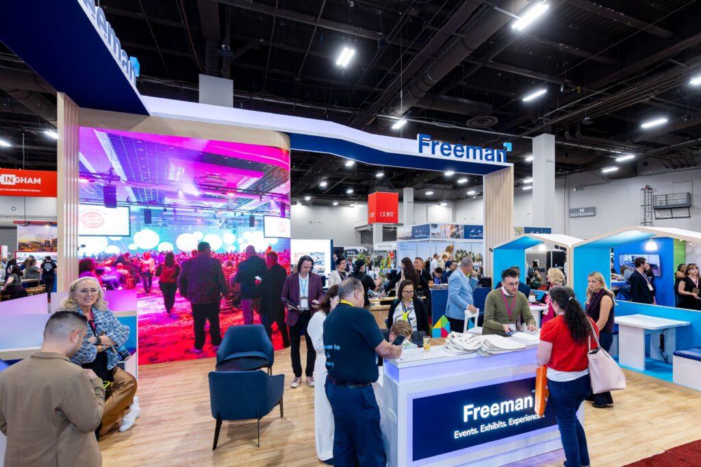 Freeman: Showcased an oversized LED screen with a curve, creating a 3-D effect while highlighting high-energy event content. Adding to the experience, the booth lit up in various colors prompted by topics visitors selected on interactive screens.