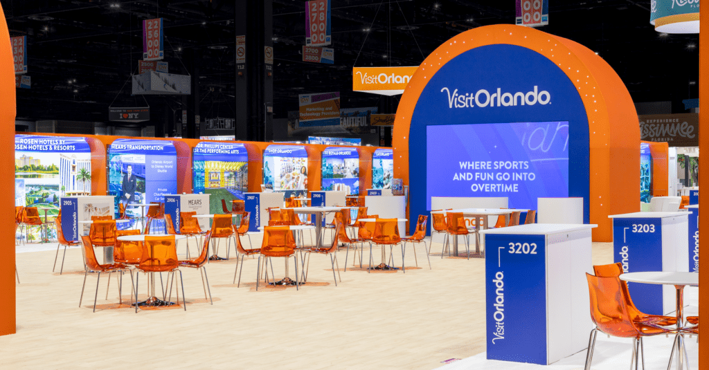 Choose furniture based on how you want people to interact. Bar‑height tables encourage quick conversations. Lounge seating invites longer stays. In fact, our focus groups found that attendees always welcome soft, comfy seating — especially during long treks across the floor.
