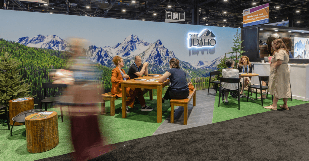Rich colors and unique design or texture can stop attendees in their tracks. And hint at what’s inside the booth. Dark green carpeting or reusable turf can evoke outdoor adventure while a patterned option could add dimension without overwhelming the space.